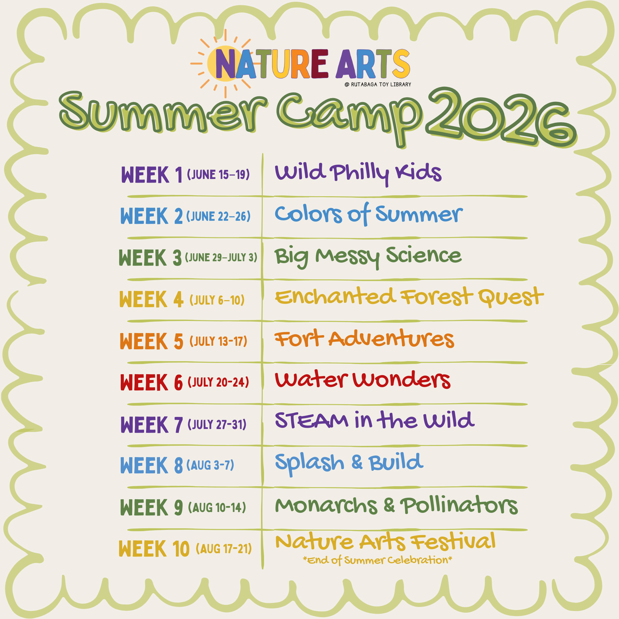 While the themes below provide inspiration, every week will be filled with the creative nature play and extensive outdoor adventures that you (and your child) love about Nature Arts!